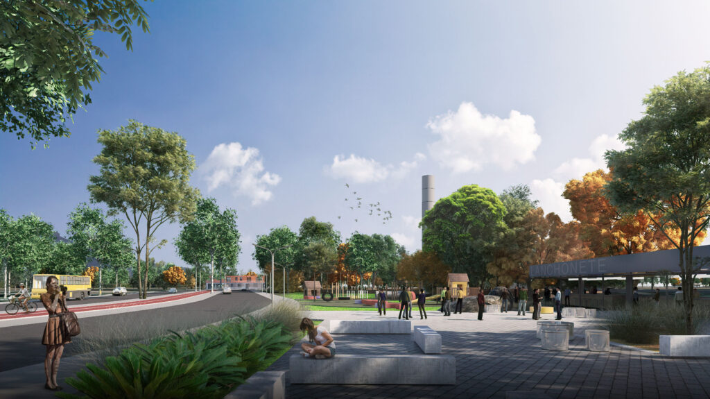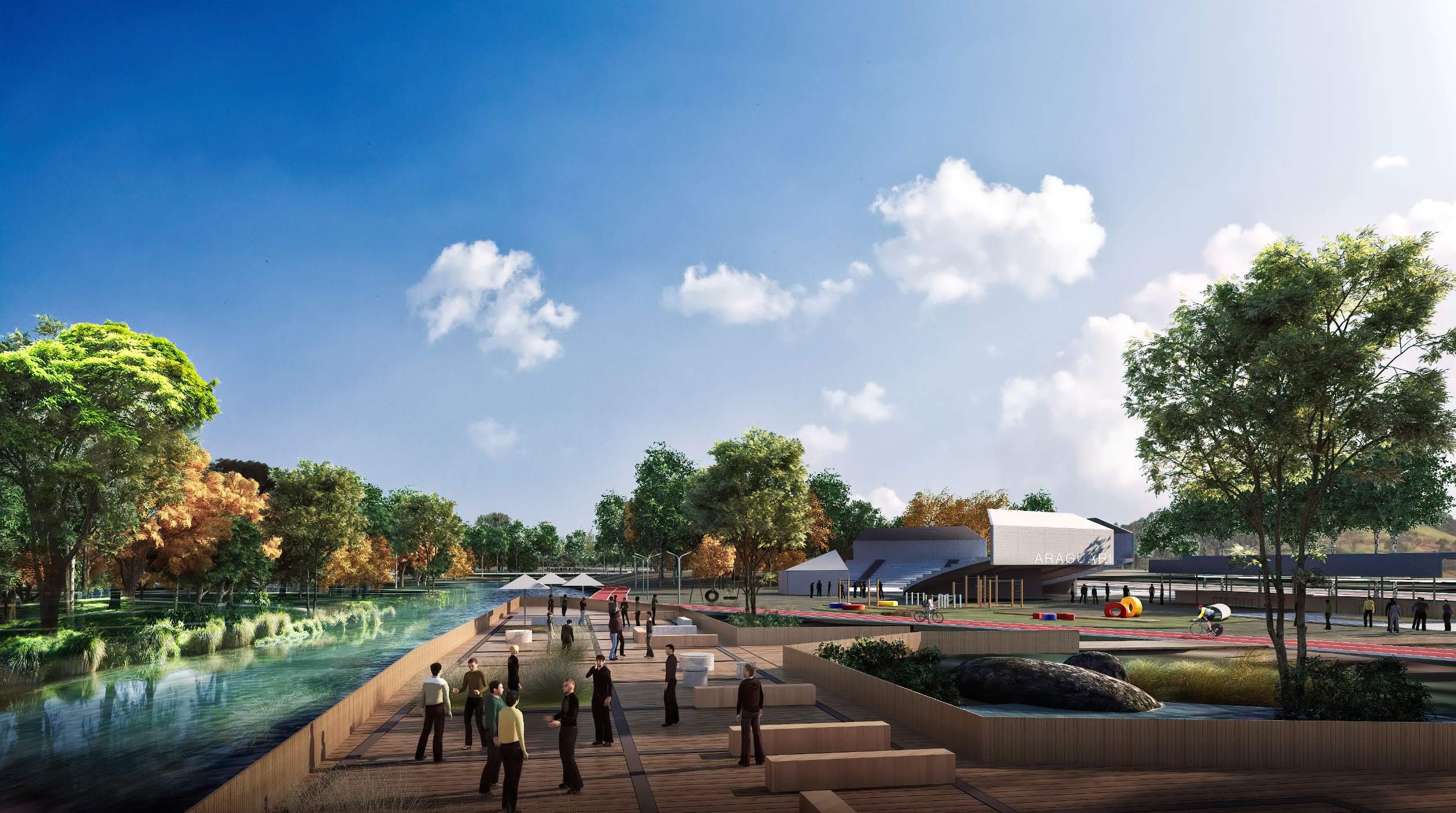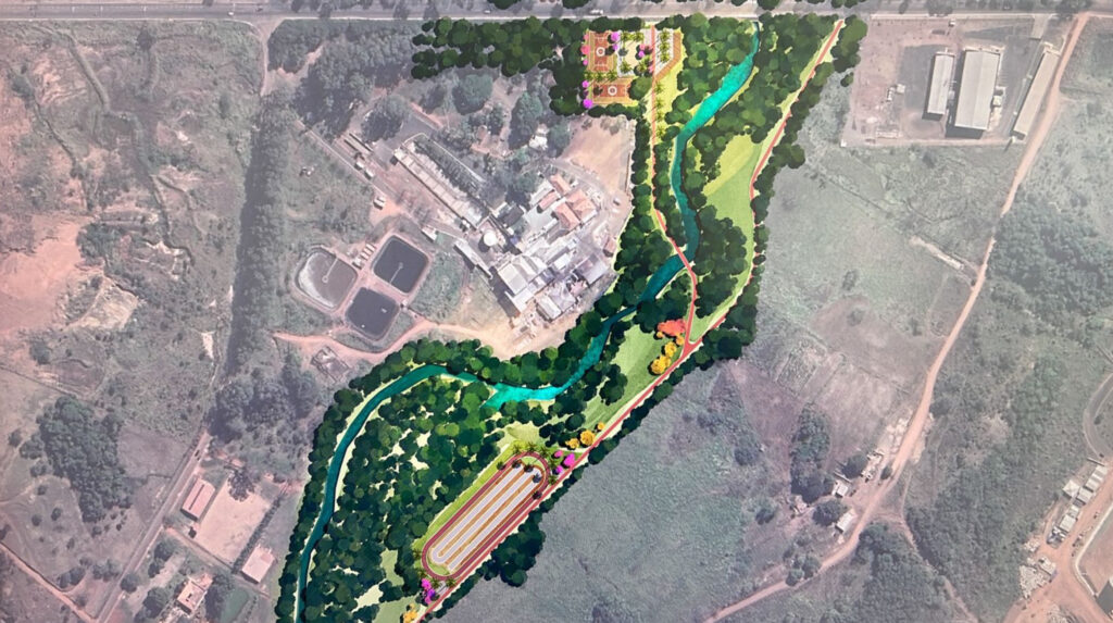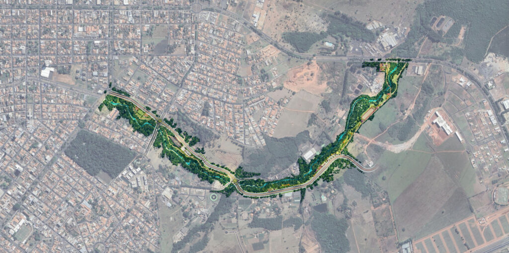 Proposta de criação de Parque Linear no entorno de uma Área de Preservação Permanente (APP) degrada pelo lançamento significativo de esgoto sanitário, águas pluviais sem controle de velocidade no curso hídrico, entre outros problemas. Com o objetivo de recompor a erosão causada, foi desenvolvido um projeto de revegetação de toda a APP existente, readequação da infraestrutura urbana e a urbanização das áreas do entorno, considerando a implantação de quadras poliesportivas, mobiliário urbano, pistas de skate, entre outros.
